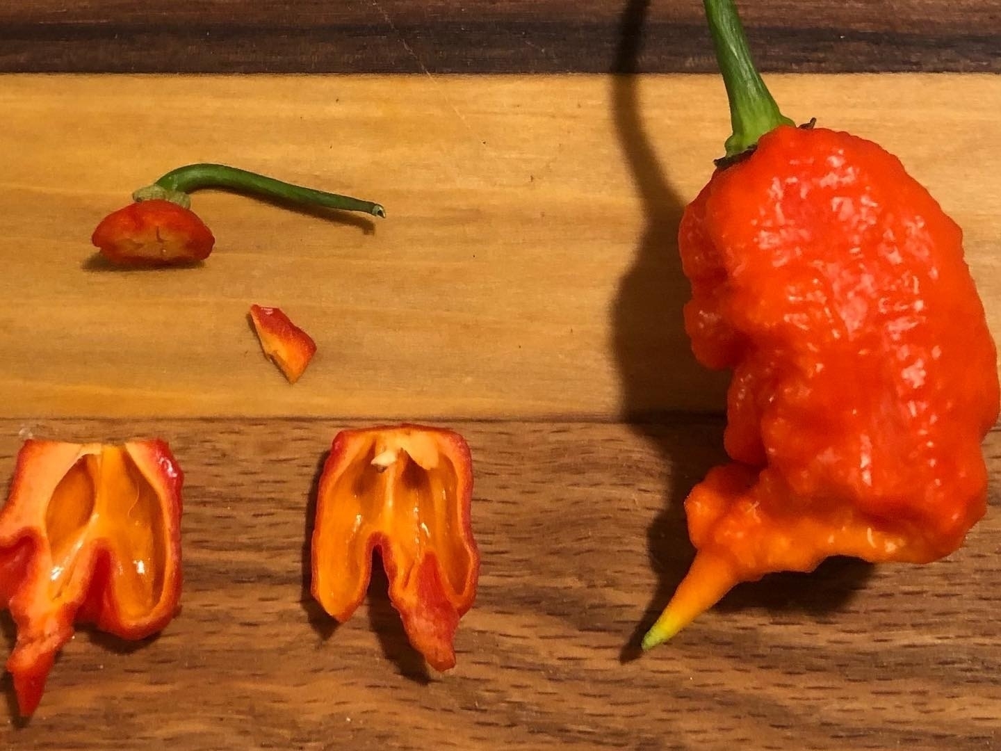 I touched that tiny sliver of pepper to my tongue for roughly a second, then pulled it away. I didn’t feel anything at all for another 2-3 seconds. And then it literally took my breath away and my mouth is still burning 10 minutes later. The Carolina Reaper is a cross between a “really nastily hot” La Soufriere pepper from the Caribbean island of St. Vincent and a Naga Viper pepper from Pakistan, with an average Scoville heat rating of about 1.5 million. #carolinareaper #whathaveidone #chiles #hotpeppers #peppers #hotsauce #chilipeppers #fermentation