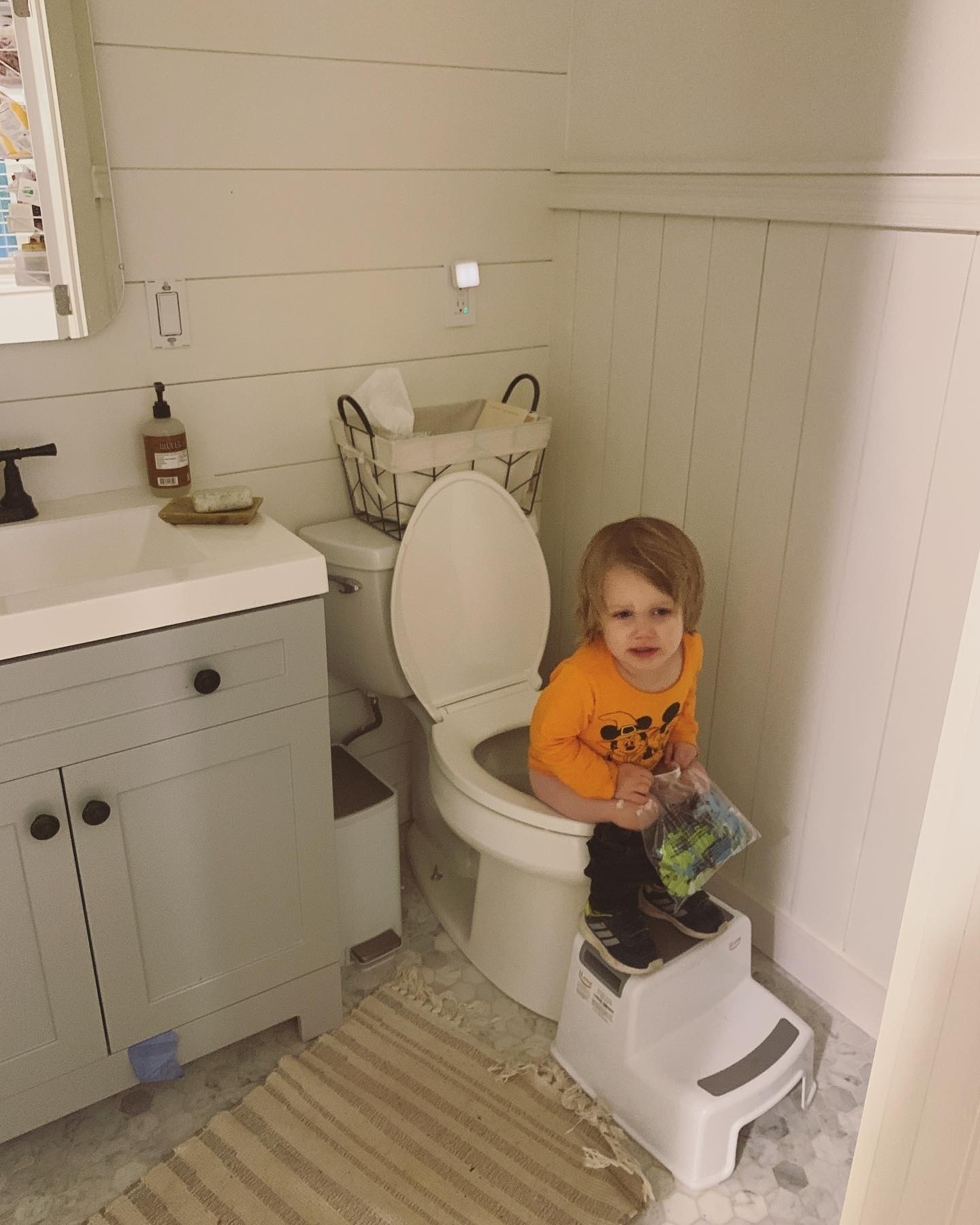 Pax went into the bathroom and closed the door…sometimes he goes in there to hide, so we didn’t think anything of it. He moved the stool over to the toilet, sat on it by himself, and did his business. Opened the door and he said, “I can use the big potty now because I’m getting big!” Too funny.
