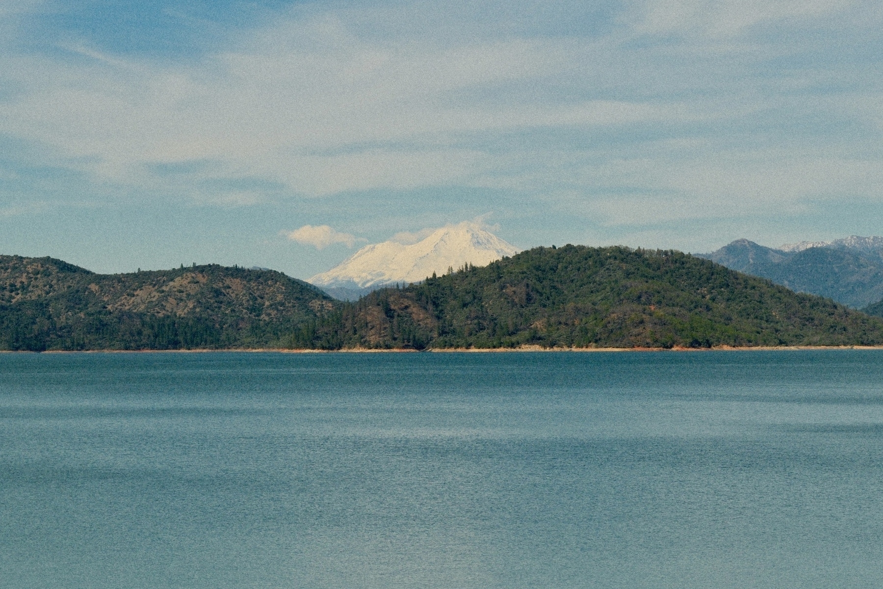 Shasta Lake with Mt. Shasta peeking out from behind.